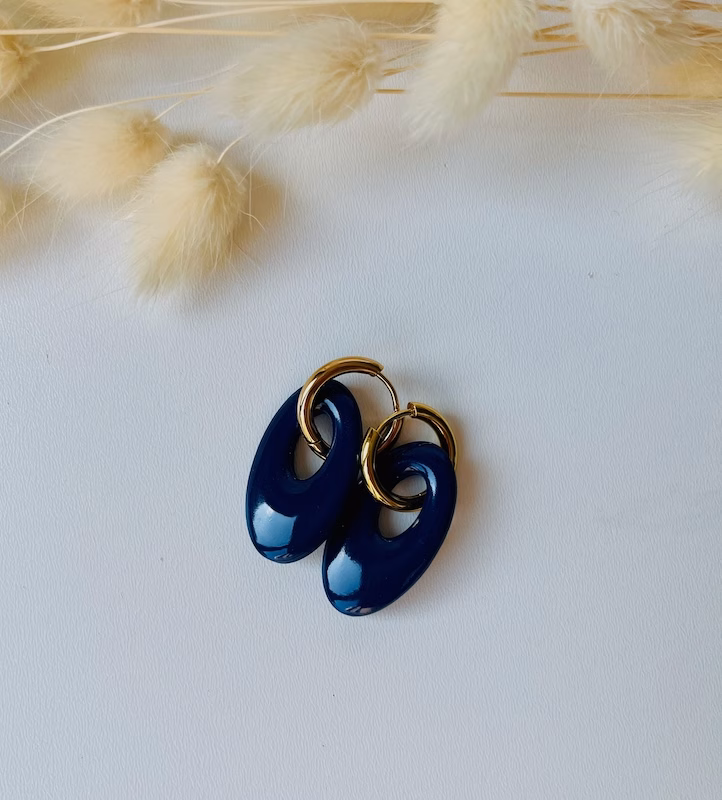 Dit prachtige ovale model, genaamd Britt, is 3 cm lang en afgewerkt met een glanzende laag resin. Het hangt aan een goudkleurige RVS hoop en geeft je outfit een stijlvolle en chique touch. Liever een zilverkleurig ringetje? Laat het gerust weten in de notities bij je bestelling.