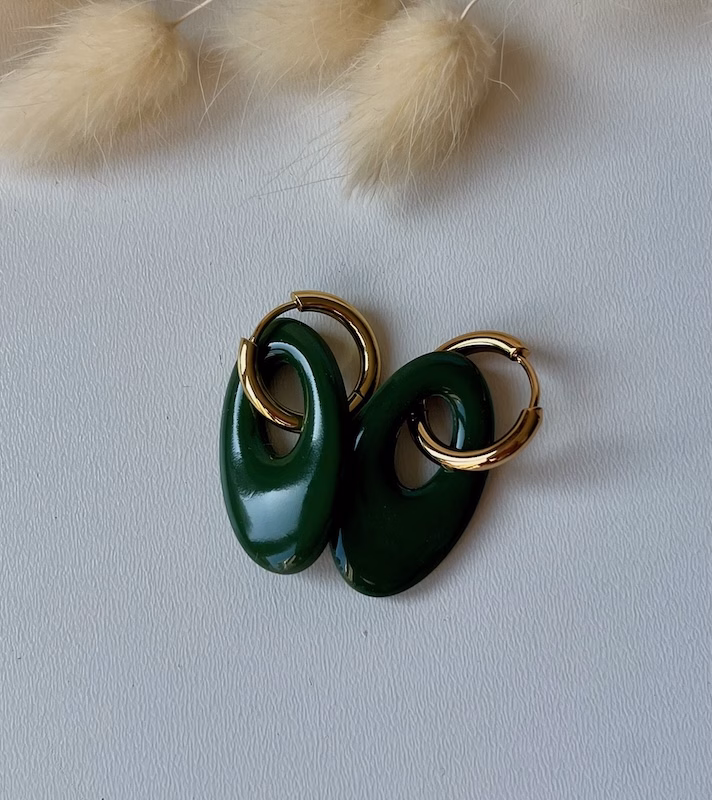 Dit prachtige ovale model, genaamd Britt, is 3 cm lang en afgewerkt met een glanzende laag resin. Het hangt aan een goudkleurige RVS hoop en geeft je outfit een stijlvolle en chique touch. Liever een zilverkleurig ringetje? Laat het gerust weten in de notities bij je bestelling.