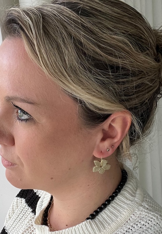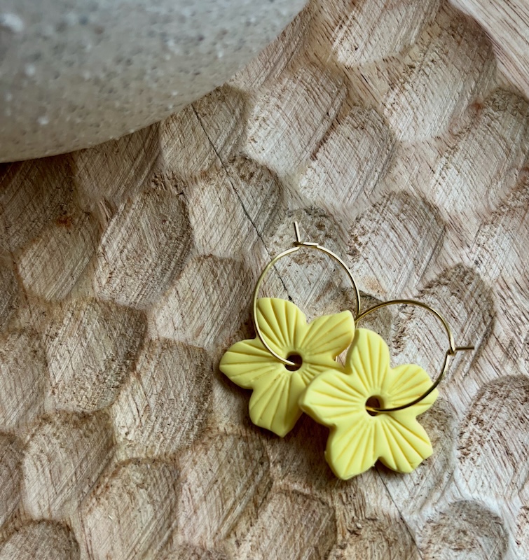 Camelia is een leuk speels bloemetje bevestigd aan een dun stainless steel ringetje. Hierdoor bungelt ze vrolijk in je oren. Liever een zilveren ringetje? Laat het achter in de notitie bij je bestelling.