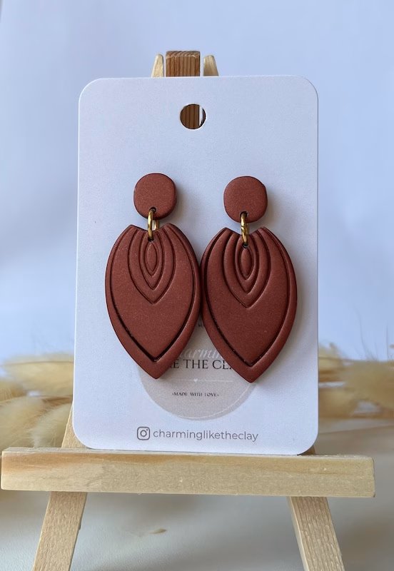Stijlvolle oorbellen van lichtgewicht polymeerklei in een warme koperkleur. De oorbel is 4 cm lang en perfect te dragen voor elke gelegenheid.