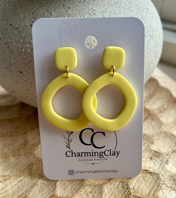 Oorbel Luna is een schattig, fijn en organisch modelletje. Met een lengte van 4 cm en afgewerkt met goudkleurige RVS ringetjes en stekertjes, is deze oorbellen gemaakt van polymeerklei.